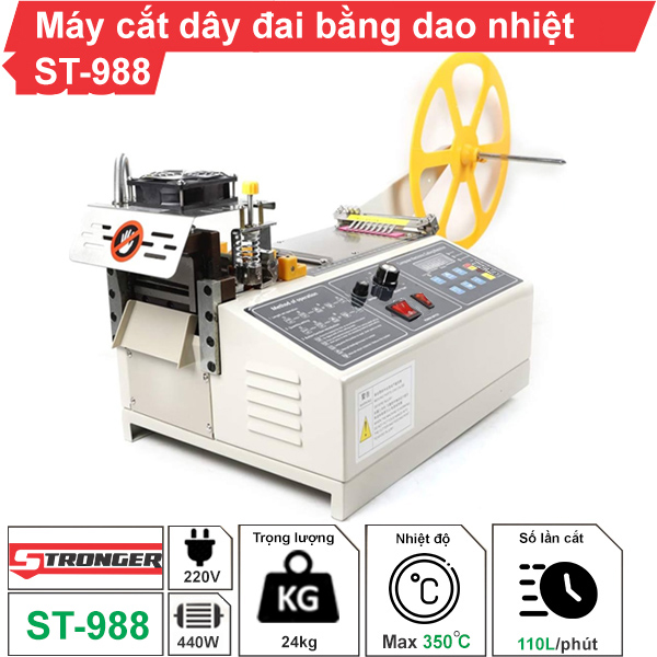 Máy cắt dây đai sử dụng dao nhiệt ST-988 là dòng máy chuyên dùng cho các cơ sở may mặc, sản xuất khóa kéo, dây nón bảo hiểm, dây đai ô tô,....mang đến nhiều ưu điểm vượt trội hơn so với các loại máy cắt thủ công khác.