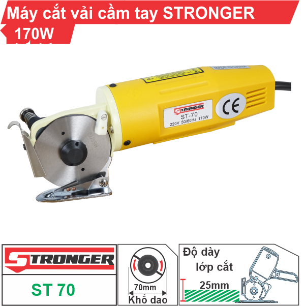 Máy cắt vải cầm tay Stronger ST-70 chuyên dùng để cắt các điểm chi tiết uốn lượn của sản phẩm, phù hợp cắt các loại coton, vải sợi, len, lụa, sợi hóa học, xốp da,... nên được sử dụng rộng rãi trong lĩnh vực may mặc quần áo, sản phẩm da, dệt may,...