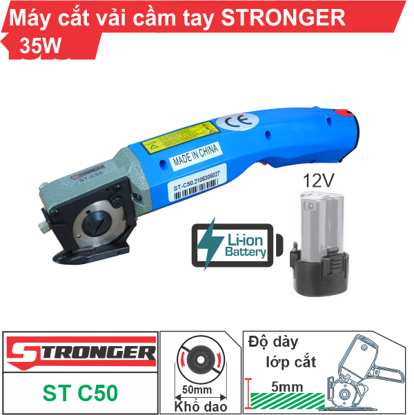 Máy cắt vải chạy bằng pin Stronger ST-C50 dùng thay thế kéo cắt thủ công một cách tiện lợi, máy cắt được nhiều lớp vải cùng lúc, với những đường cong uốn lượn phức tạp.